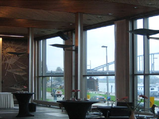 Hierdoor kon, in samenhang met een aanpassing der technische installaties, zonwering achterwege blijven en werd het unieke uitzicht op de Rijn niet langer belemmerd.